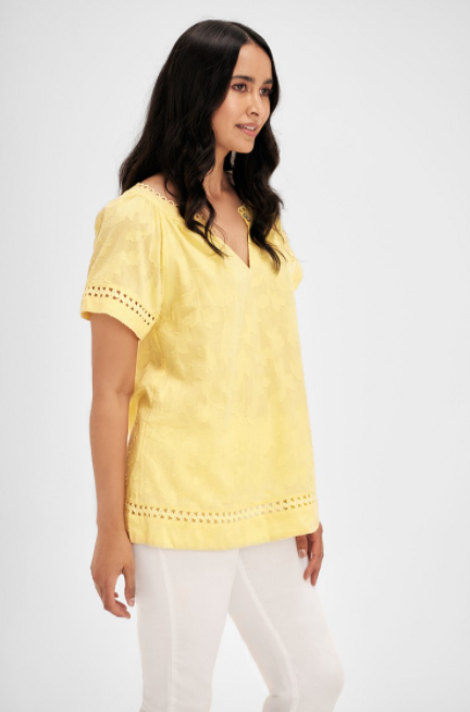 Wear this top from Blue Illusion with these white pants and sandals that are very similar. This summery new marigold color top is made of 100% cotton and features a loop trim detail at the neckline for a pretty, feminine look. This sunny top features a floral jacquard pattern and lace edging for a beachy vibe. Click here to shop Blue Illusion’s Jacquard Cotton Top.
