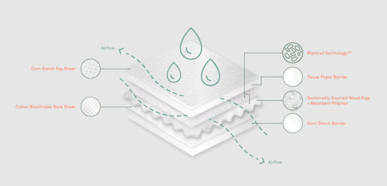 The best plant-based diapers on the market. Your baby's delicate skin will only be touched by pure cotton, sustainable wood-pulp, and non-GMO cornstarch. They have used Plantcell Technology, wetness is kept at bay for up to 12 hours, and the absorbency is 40 percent higher than with conventional disposables.