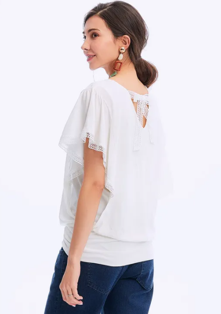 You should stock up on this feminine top when your typical clothes are getting a touch too tight and too short. Lace trim and ruffled sleeves with lace tie embellishments on the back make this a versatile choice for both office and weekend wear. It's suitable for all stages of pregnancy and nursing. Click here to buy now.